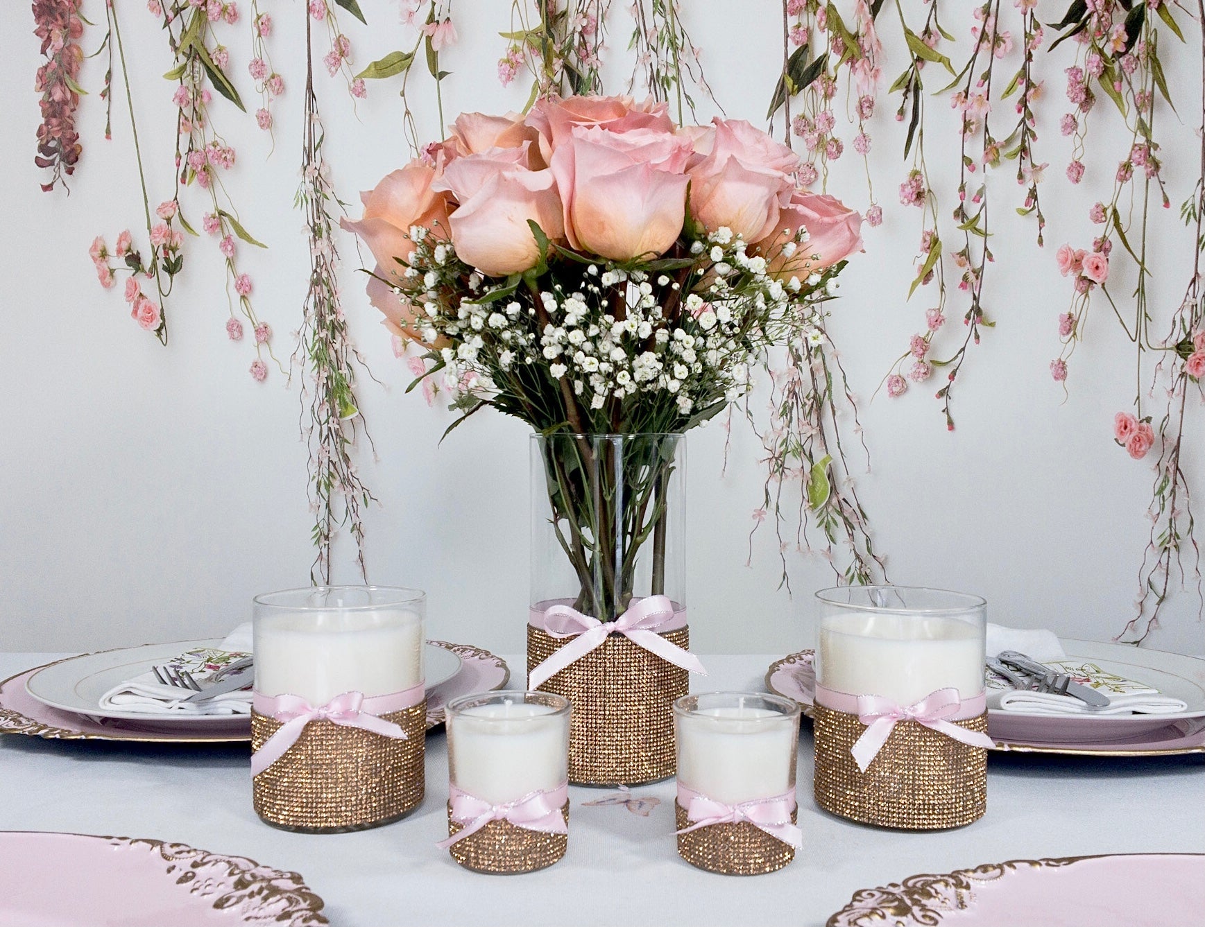 When your event calls for a pop of golden shimmer the It's A Party collection is the perfect compliment to any table setting. This votive unscented candle I handcrafted with the most luxurious crème wax made of a vegan blend of coconut and soy wax. A beautiful natural iridescent pearlescent mica powder is gently mixed in to give off a beautiful shimmery sparkle while the candle is burning and the glass vessel has a beautiful gold rhinestone bottom that I have hand placed on with a light pink satin ribbon with silver edges hand tied to complete the look. Sit back and enjoy it's beautiful glow and sparkle.