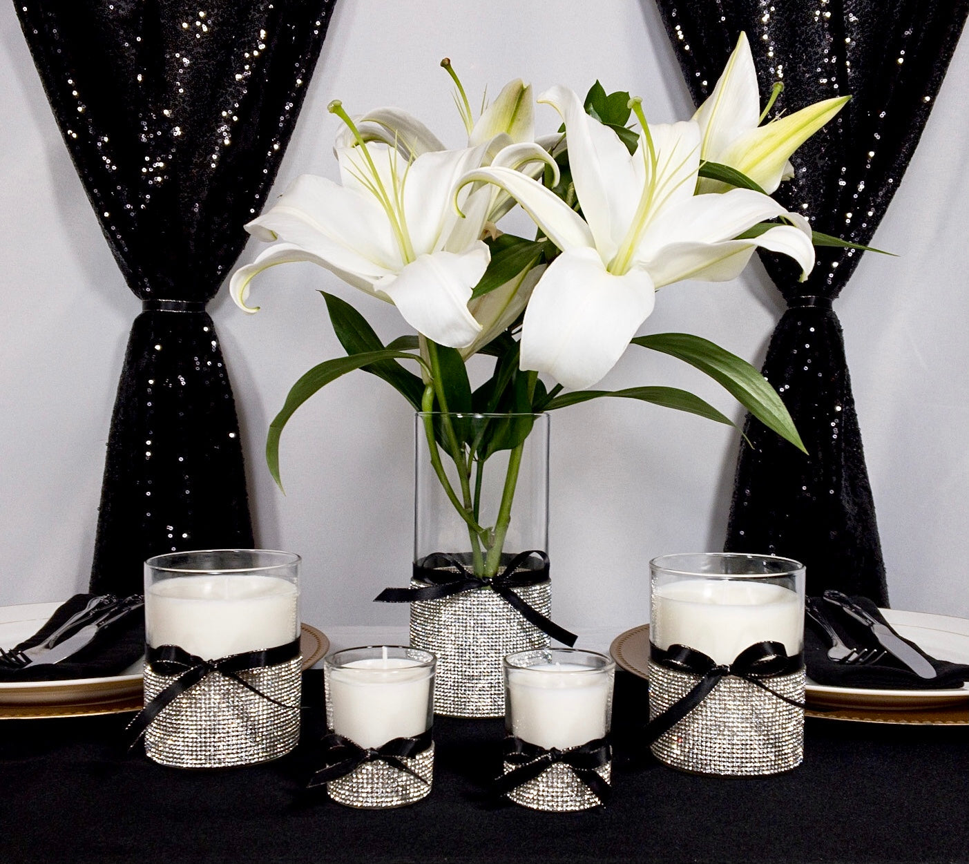 When your event calls for elegant attire The Tuxedo collection is the perfect compliment to any table setting. This 11oz unscented candle I handcrafted with the most luxurious crème wax made of a vegan blend of coconut and soy wax. A beautiful natural iridescent pearlescent mica powder is gently mixed in to give off a beautiful shimmery sparkle while the candle is burning and the glass vessel has a beautiful silver rhinestone bottom that I have hand placed on with a black satin ribbon with silver edges hand tied to complete the look. Sit back and enjoy it's beautiful glow and sparkle.