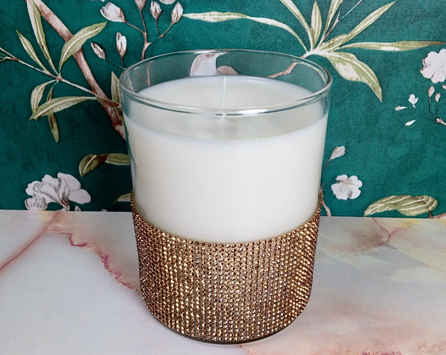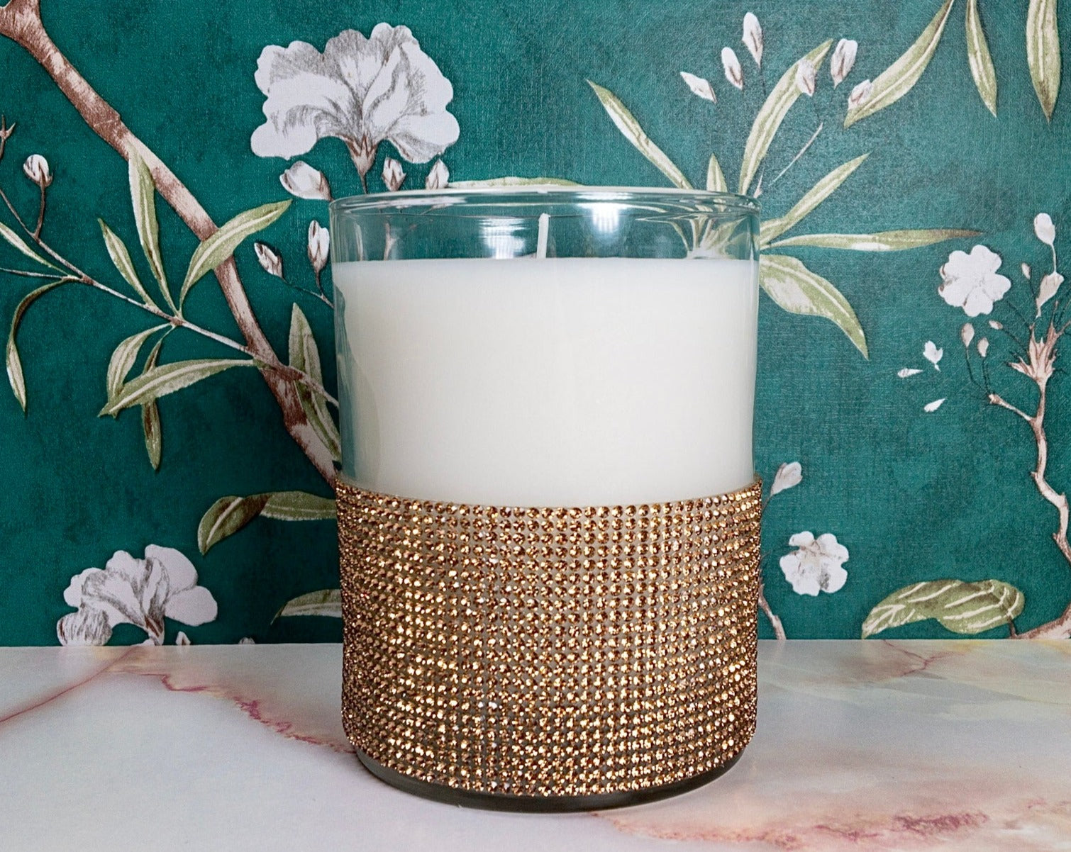 When your next event or dinner party calls for an extra bit of sparkle this 10oz unscented candle is the perfect accent to make any moment shine. This candle has been hand wrapped with a beautiful gold rhinestone banding and has been hand poured with the most luxurious wax made of a vegan blend of Coconut, Soy and Apricot Crème wax and for an extra sparkly touch an all-natural pearlescent iridescent mica powder has been hand mixed into the wax. As your candle burns you will see the wax has a beautiful iridescent shimmer.