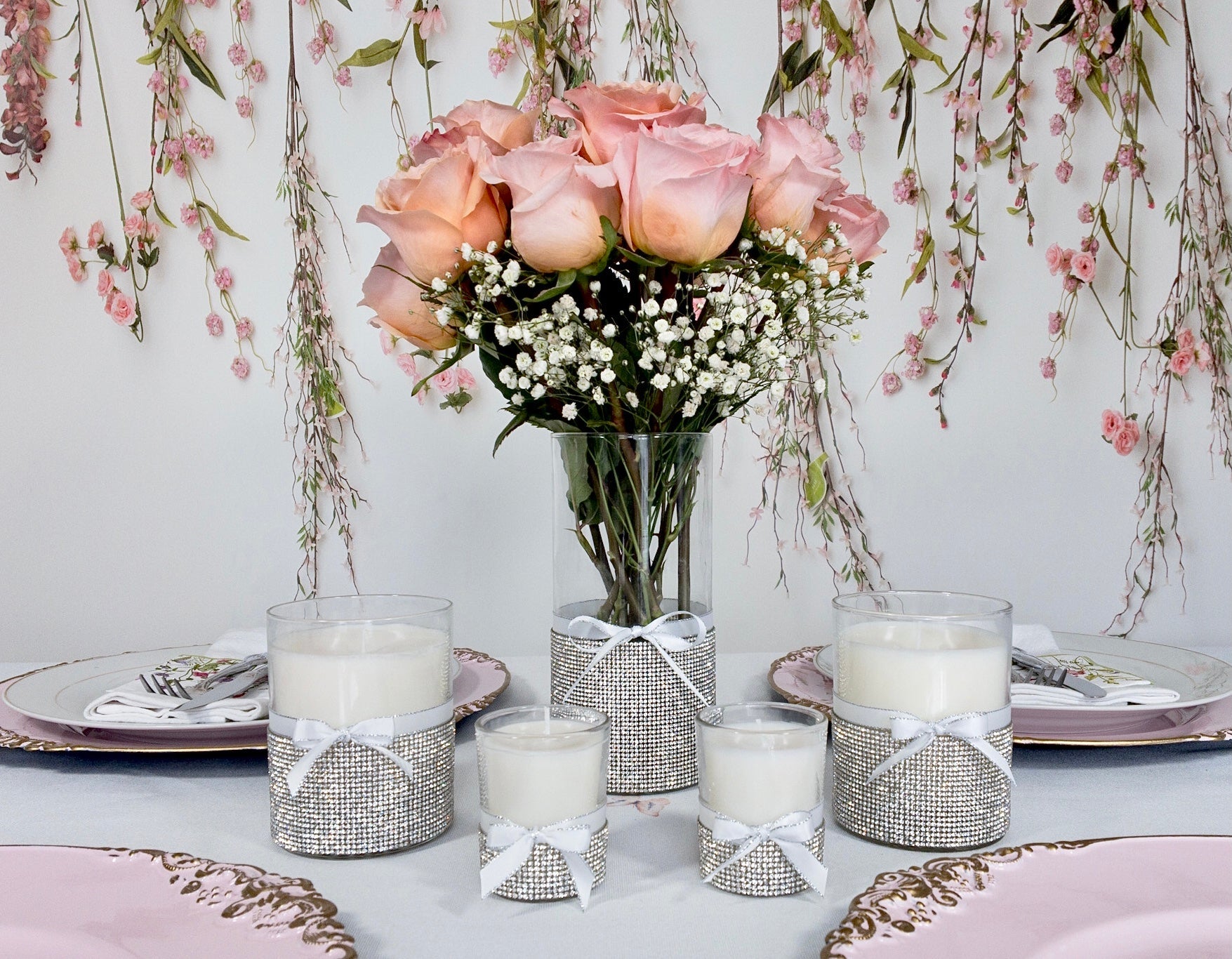 When your event calls for a fun sparkly attire the Twinkling Lights collection is the perfect compliment to any table setting. This votive unscented candle I handcrafted with the most luxurious crème wax made of a vegan blend of coconut and soy wax. A beautiful natural iridescent pearlescent mica powder is gently mixed in to give off a beautiful shimmery sparkle while the candle is burning and the glass vessel has a beautiful silver rhinestone bottom that I have hand placed on with a white satin ribbon with silver edges hand tied to complete the look. Sit back and enjoy it's beautiful glow and sparkle.
